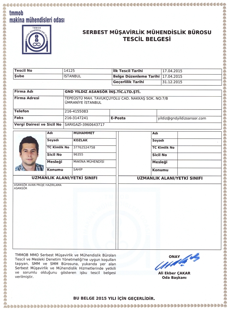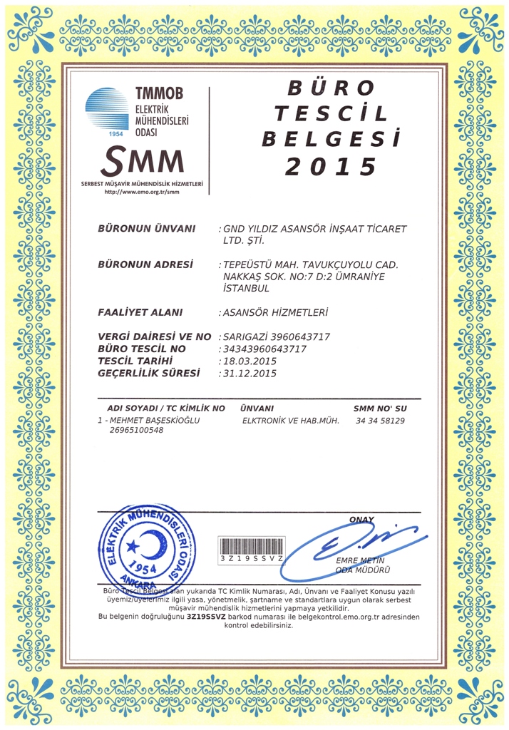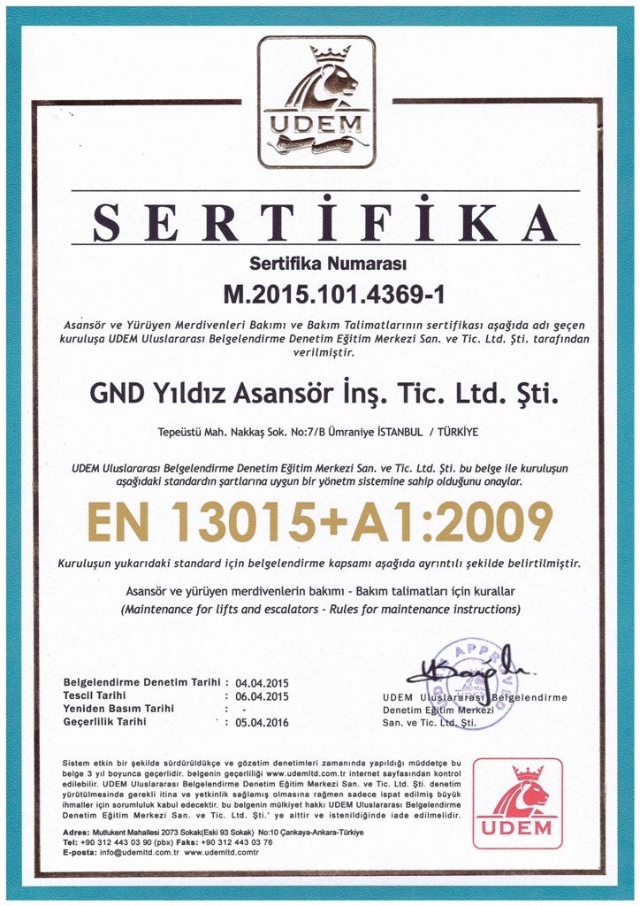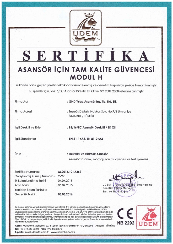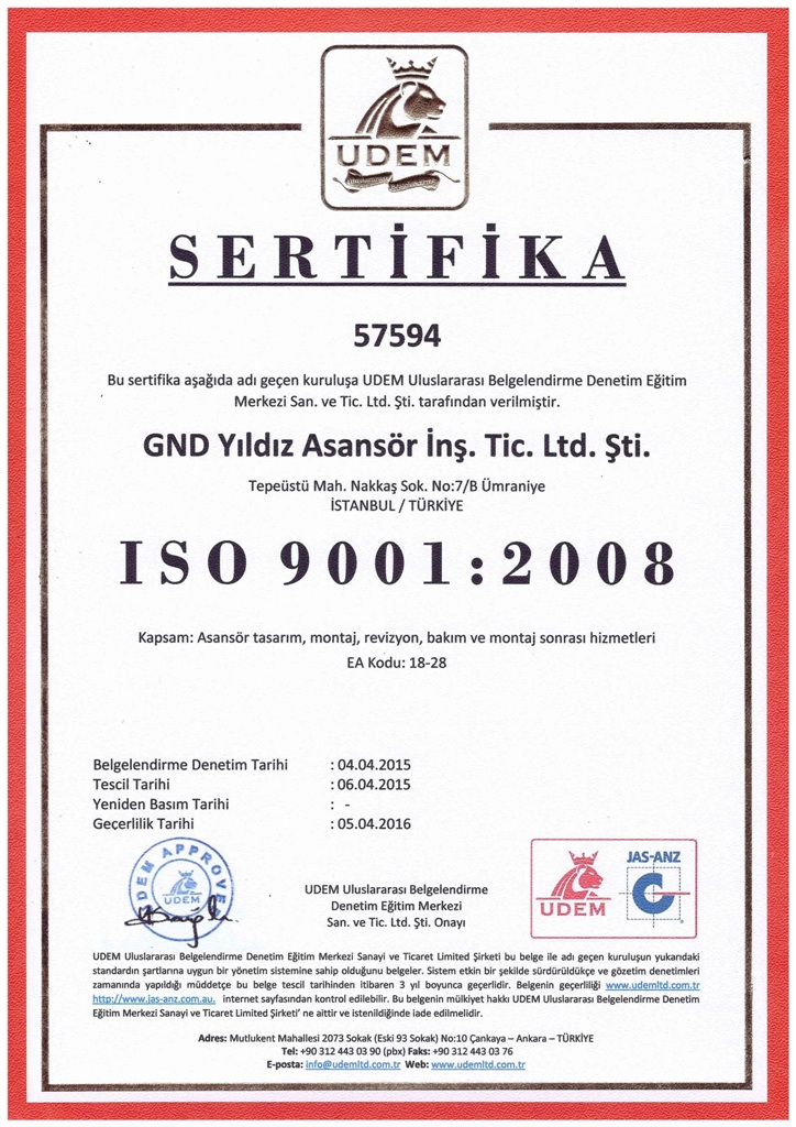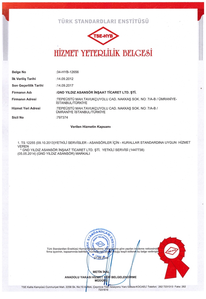 TSE Hizmet Yeterlilik Belgesi ISO 9001:2008 Kalite Yönetim Belgesi CE Belgesi